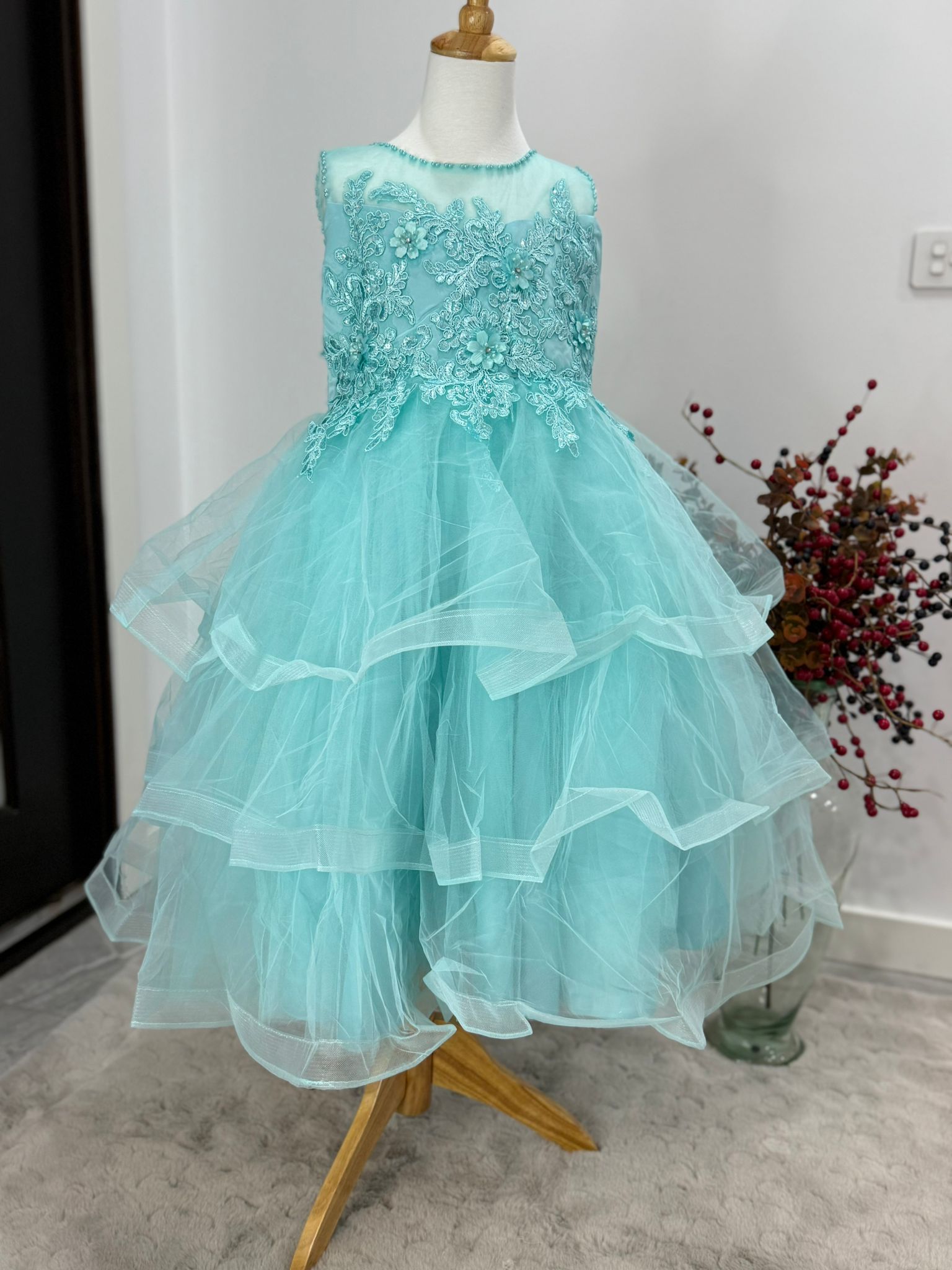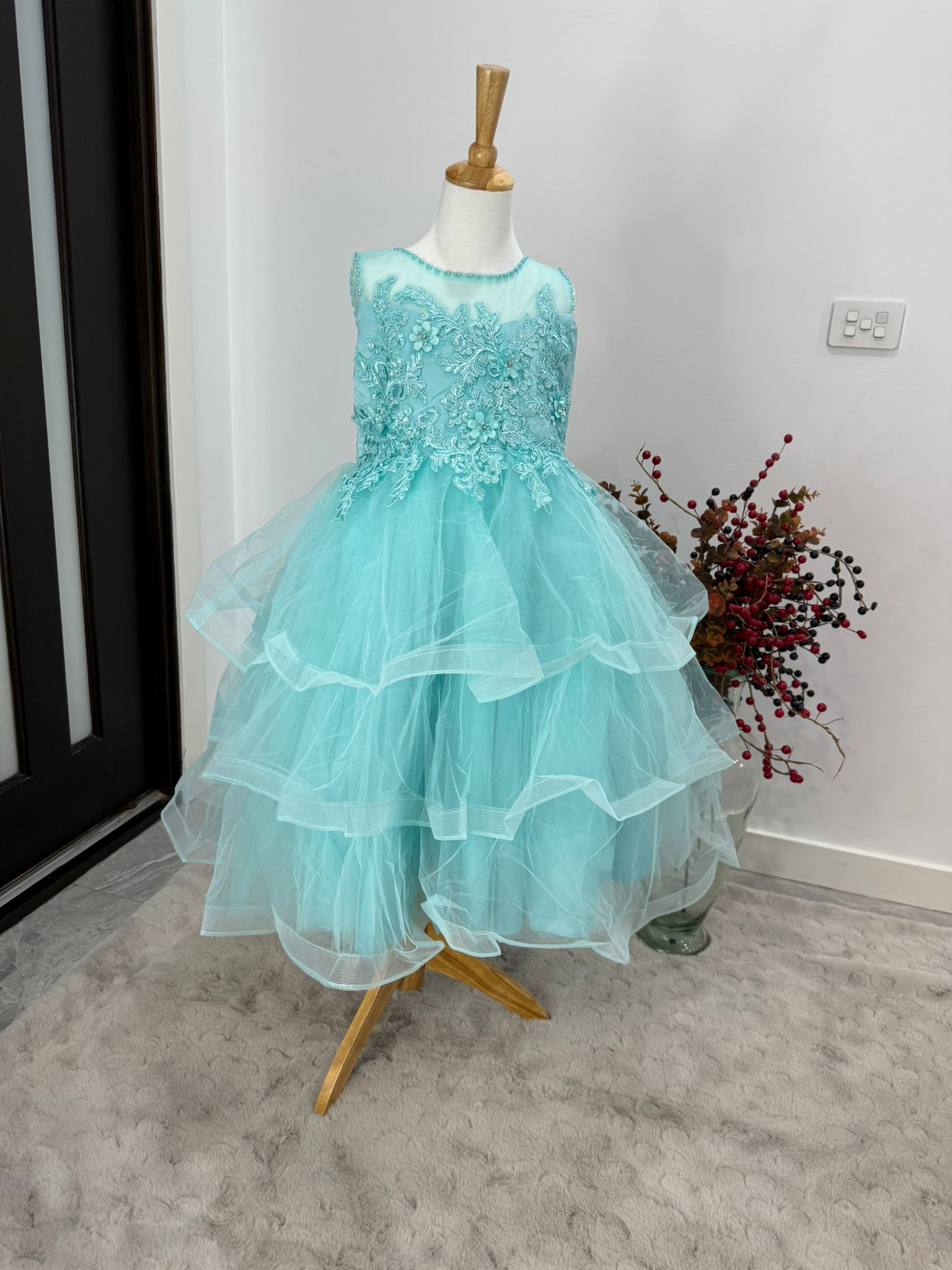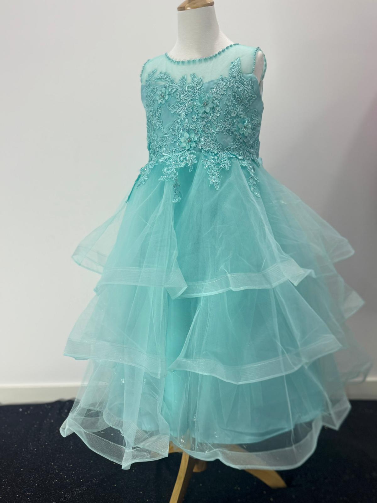 The multi-tiered tulle skirt adds breathtaking volume, making it ideal for twirling at birthdays, weddings, or special events. Designed in a charming aqua blue shade, this dress captures attention while keeping your child comfortable and stylish all day long.
