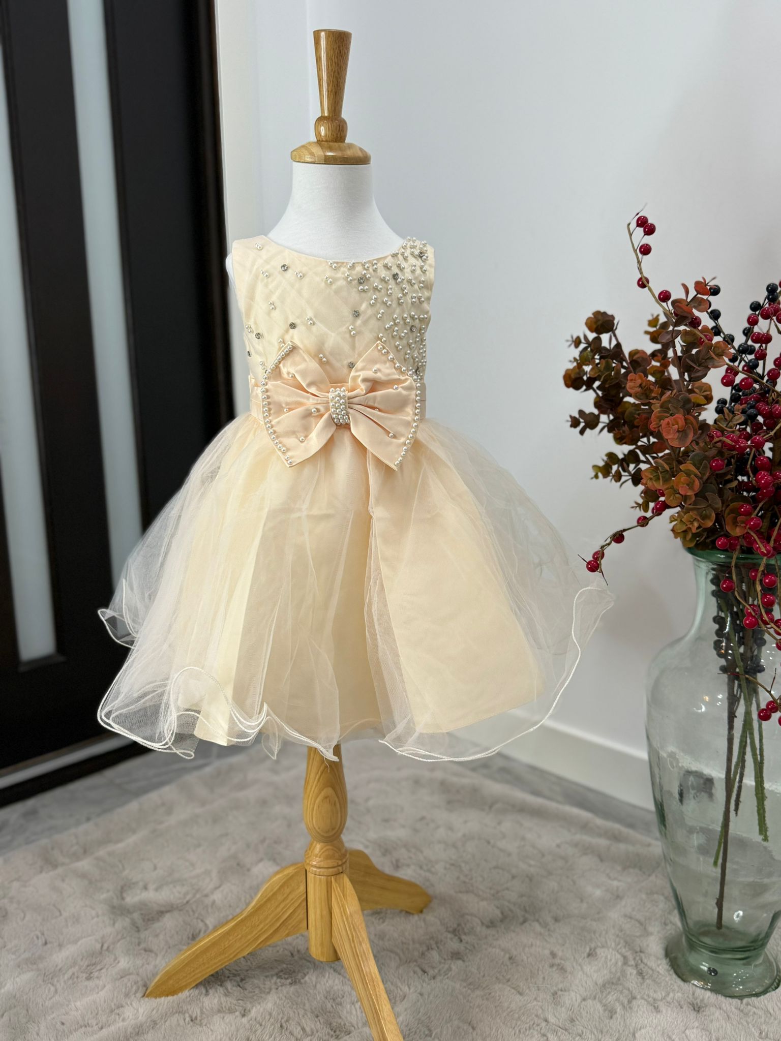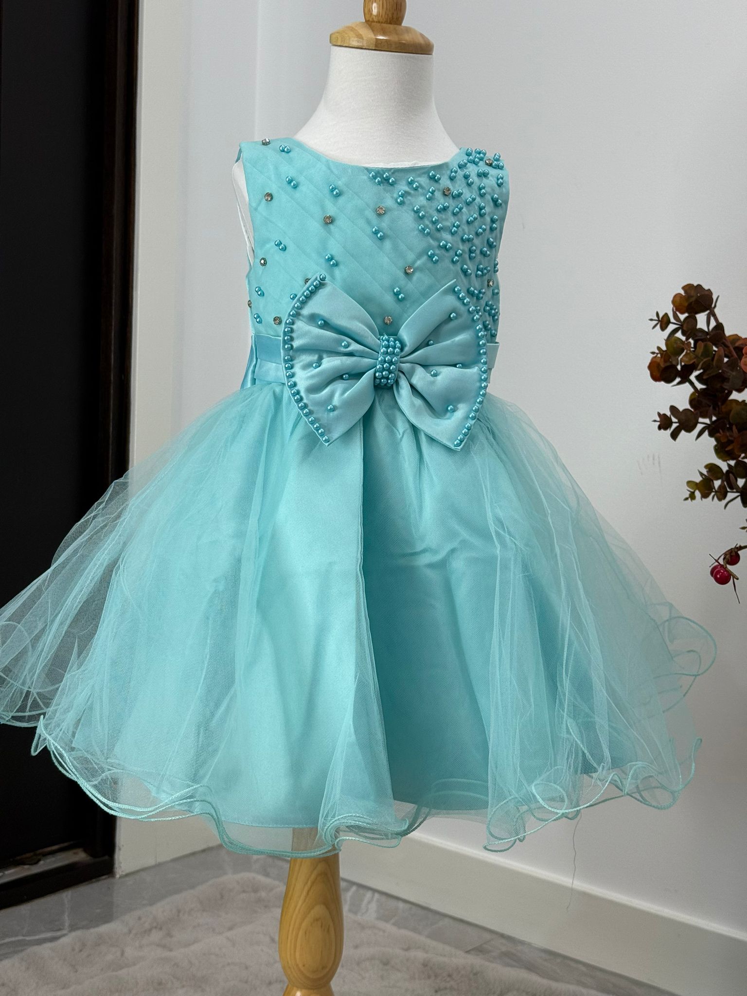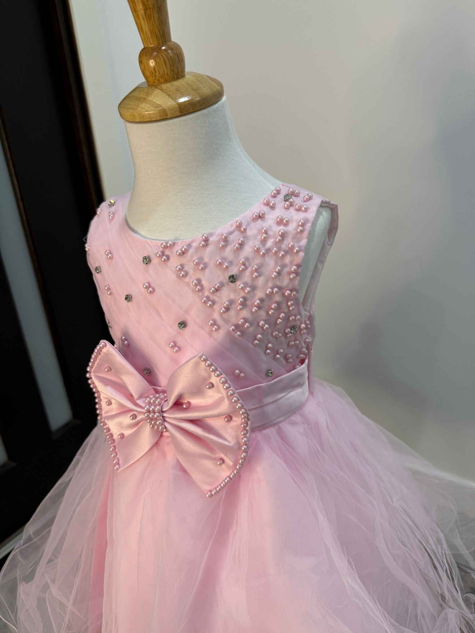 Grace meets charm in the Pearl Elegance Tulle Princess Dress, designed to make your little one shine at every celebration. This stunning dress features a delicately embellished bodice with hand-applied pearl details and a voluminous layered tulle skirt that floats with every twirl. A luxurious satin bow at the waist, adorned with pearls and rhinestones, adds a glamorous finish. Perfect for birthdays, weddings, formal parties, and pageants.
