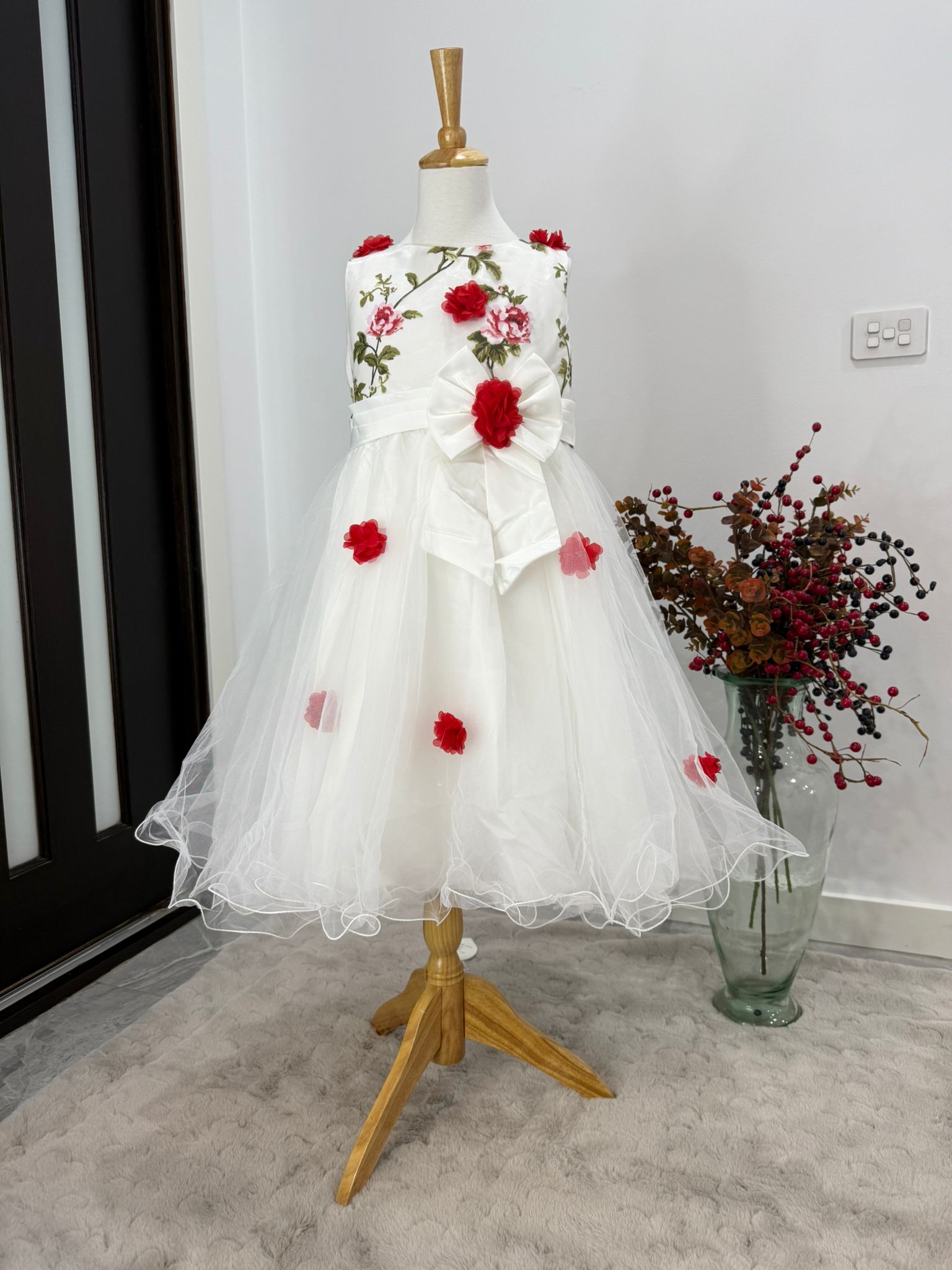 Let your little one bloom with charm in the Rosette Garden White Dress, a perfect choice for girls who love both flowers and fun! This stunning white dress features elegant green vine floral prints and is accented with vibrant red 3D rosettes that add texture and style. The wide waistband with a large bow at the back gives a polished princess silhouette, while the soft tulle skirt brings volume and grace.