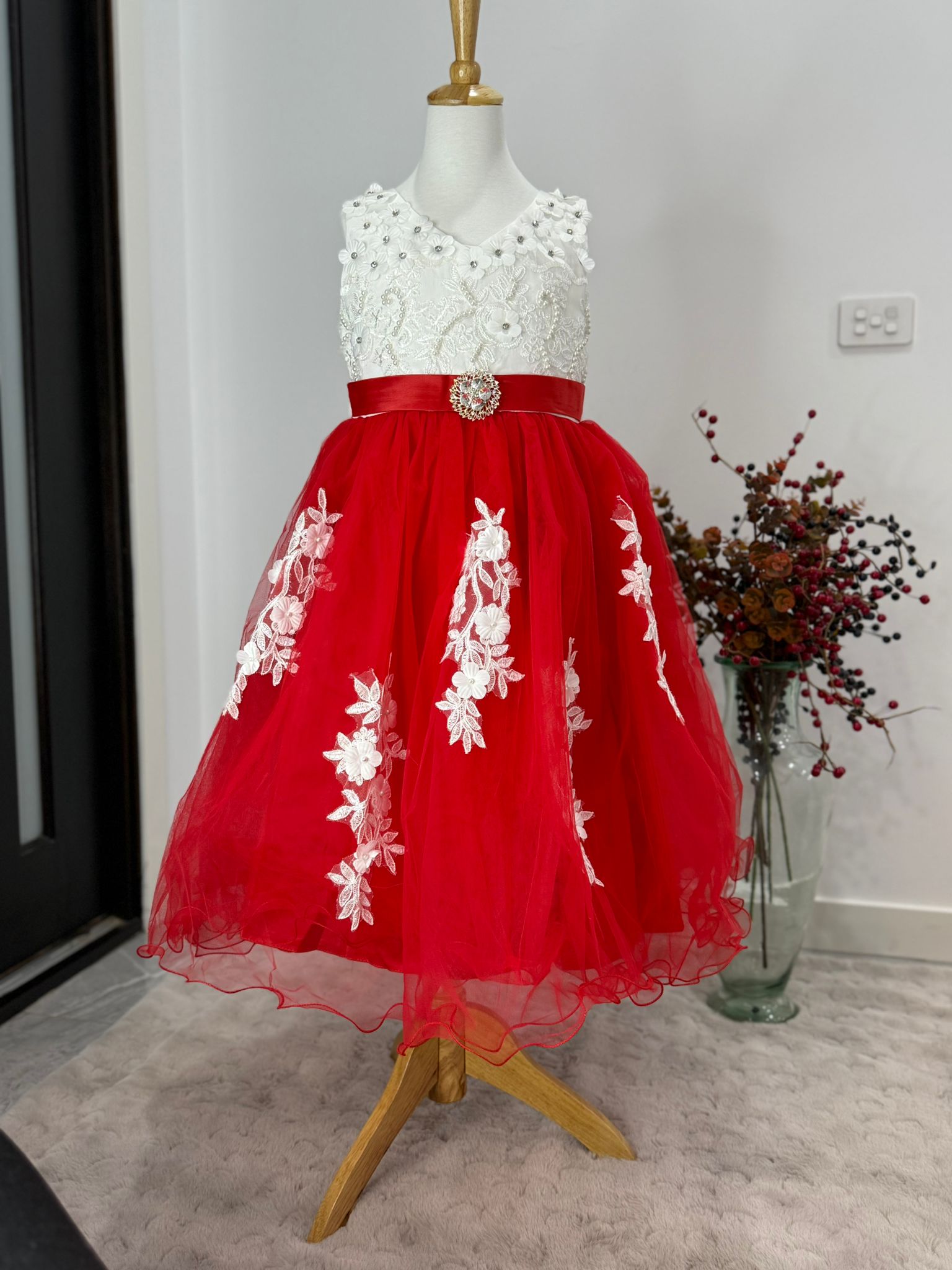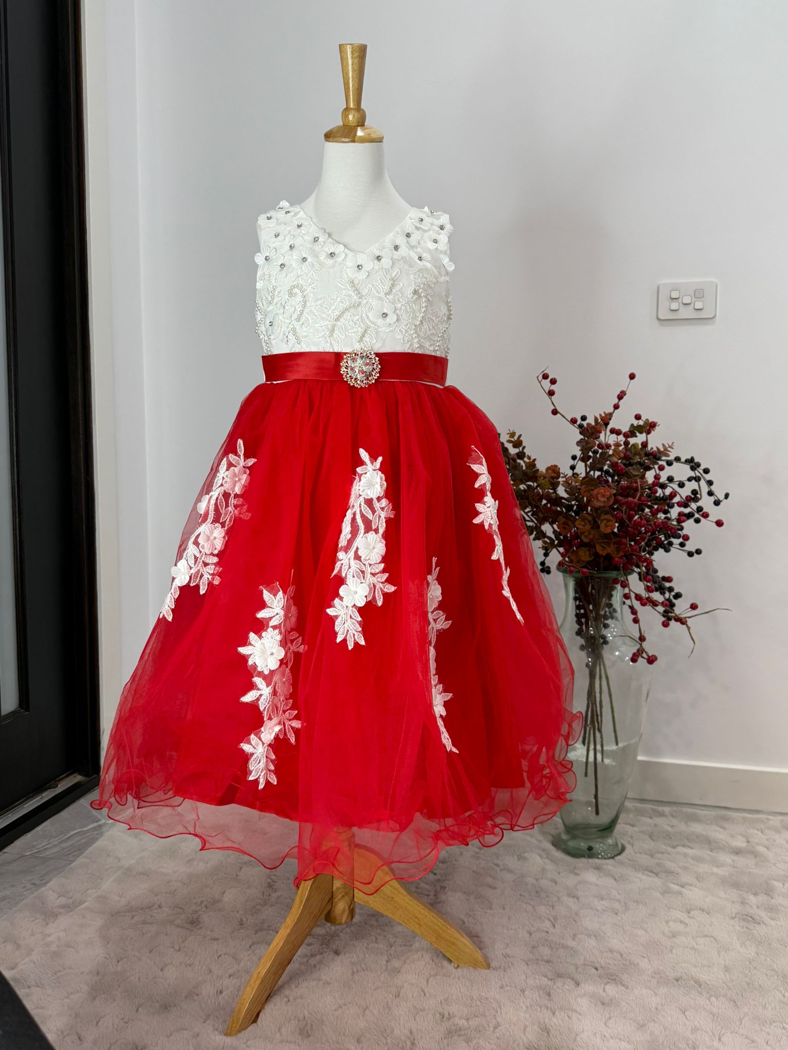 Make every special occasion unforgettable with the Royal Bloom Red & White Embroidered Tulle Dress, a stunning blend of regal charm and delicate craftsmanship. The sleeveless bodice is adorned with white floral lace, 3D appliqués, and pearls, creating a look that is both elegant and refined. The voluminous red tulle skirt features white floral embroidery that adds a graceful contrast and eye-catching detail. A satin waistband with a sparkling brooch accent completes the luxurious silhouette.